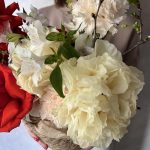Композиция с французскими розами, пионами и цветущими ветками