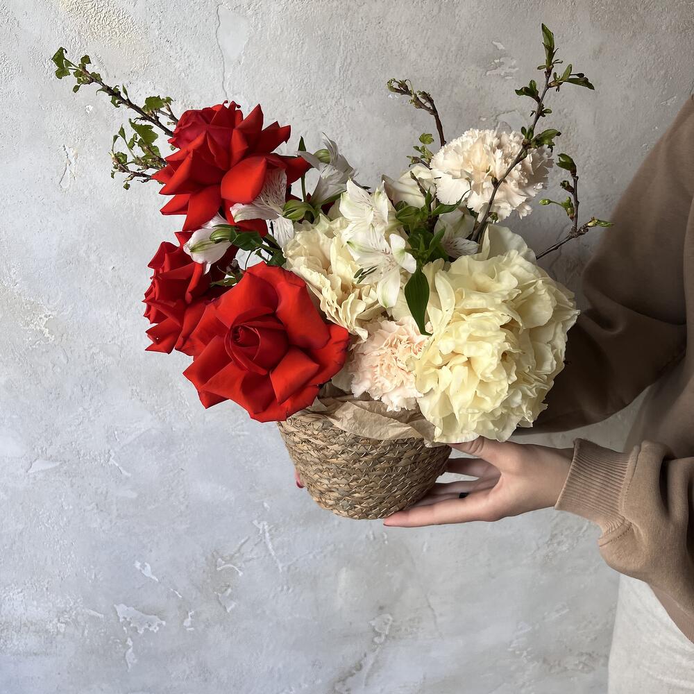 Альстромерия – 2 шт.Пион – 2 шт.Роза – 4 шт.Гвоздика – 3 шт.Оазис – 1 шт.Ветка – 1 шт.кашпо джутовое – 1 шт.