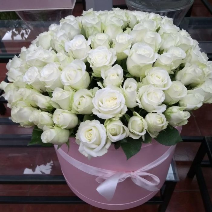 Роза белая – 101 шт.Коробка шляпная – 1 шт.Оазис флористический – 1 шт.