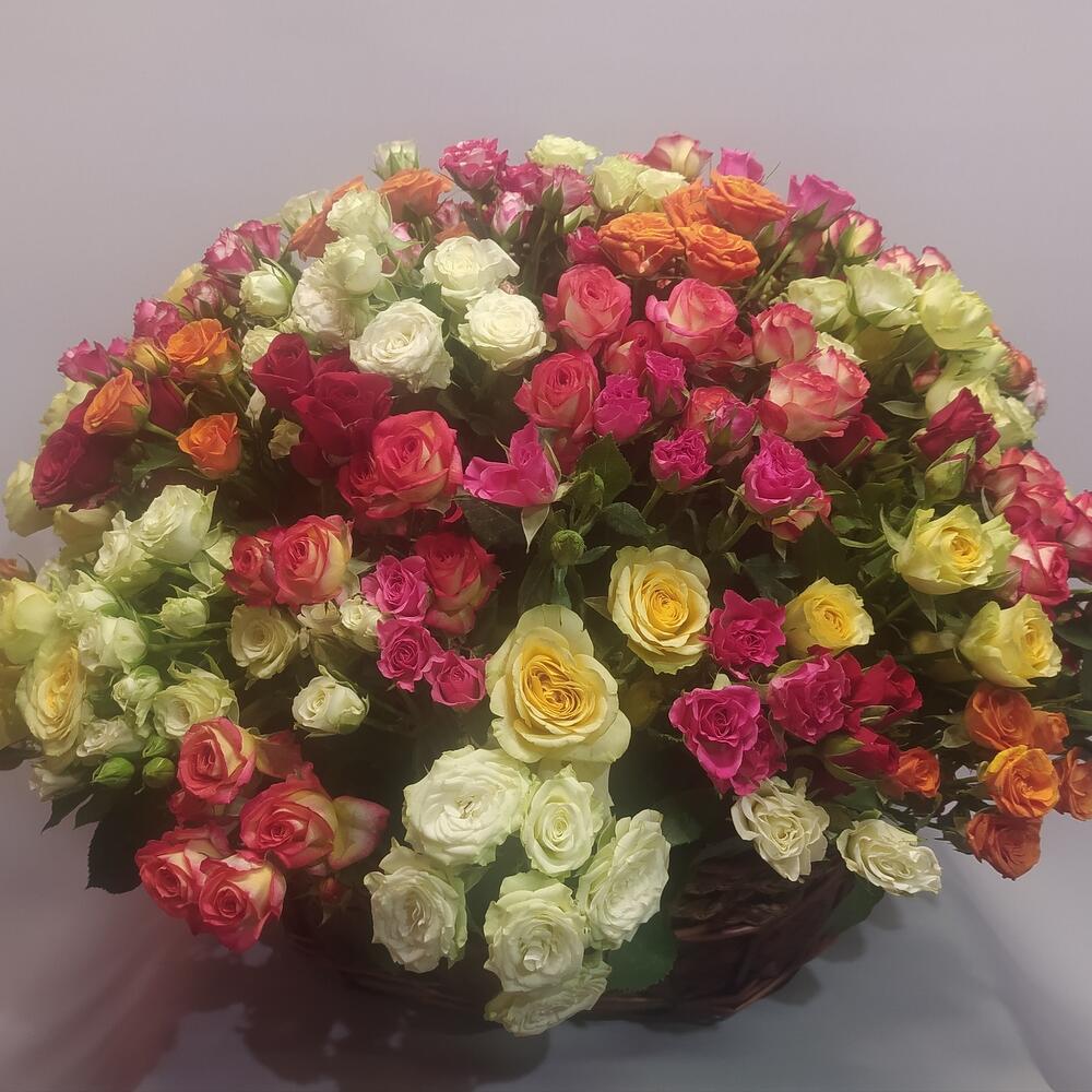 роза кустовая микс – 81 шт.Корзина плетеная – 1 шт.Оазис флористический – 3 шт.