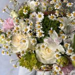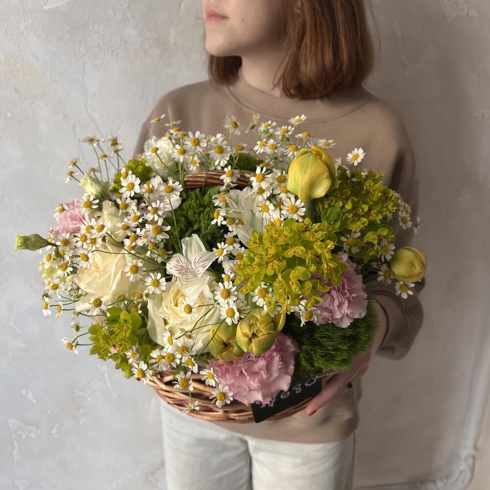 Альстромерия – 2 шт.Корзина – 1 шт.Лизиантус – 1 шт.Тюльпан – 4 шт.Роза – 3 шт.Гвоздика – 3 шт.Оазис – 1 шт.Матрикария – 7 шт.Молочай – 4 шт.гринтрик – 4 шт.