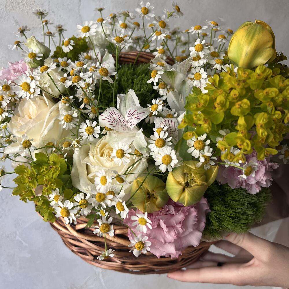 Корзина с нежными розами, тюльпанами и ромашками