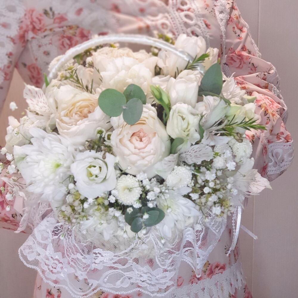 Эвкалипт – 1 шт.Хризантема кустовая белая – 2 шт.Лизиантус Алиса белый – 2 шт.Хамелациум белый – 1 шт.Альстромерия белая или розовая – 1 шт.гипсофила белая – 1 шт.роза пионовидная Дэвид остина – 3 шт.диантус белый сортовой – 3 шт.
