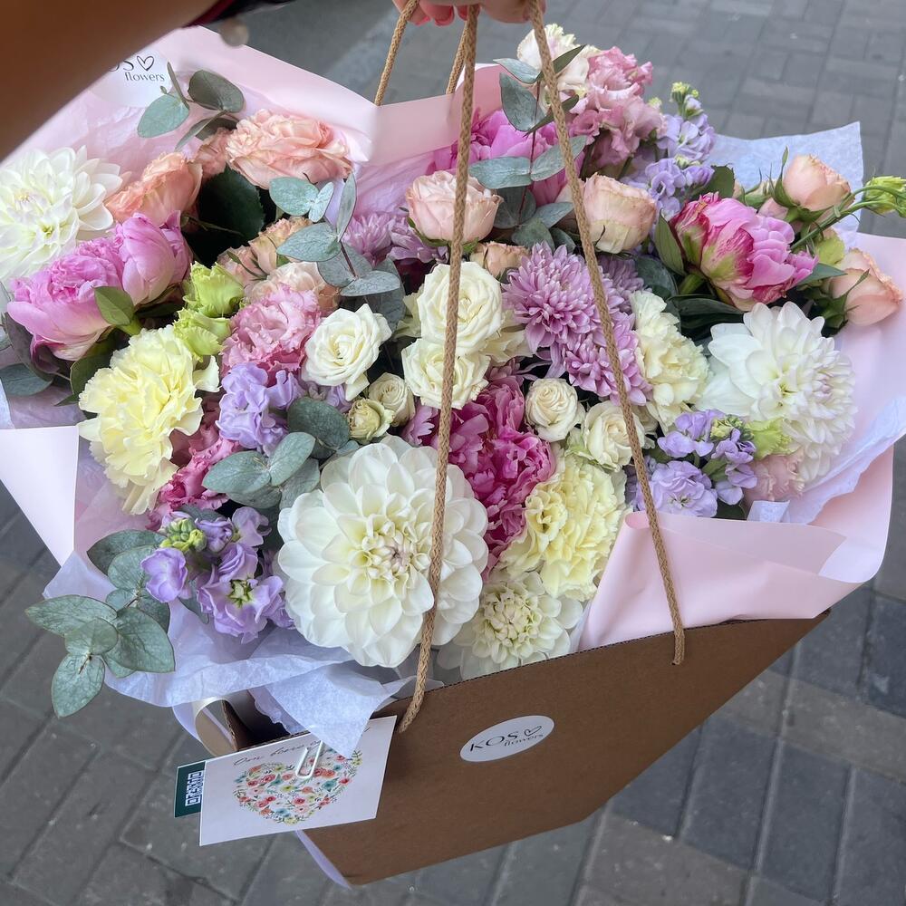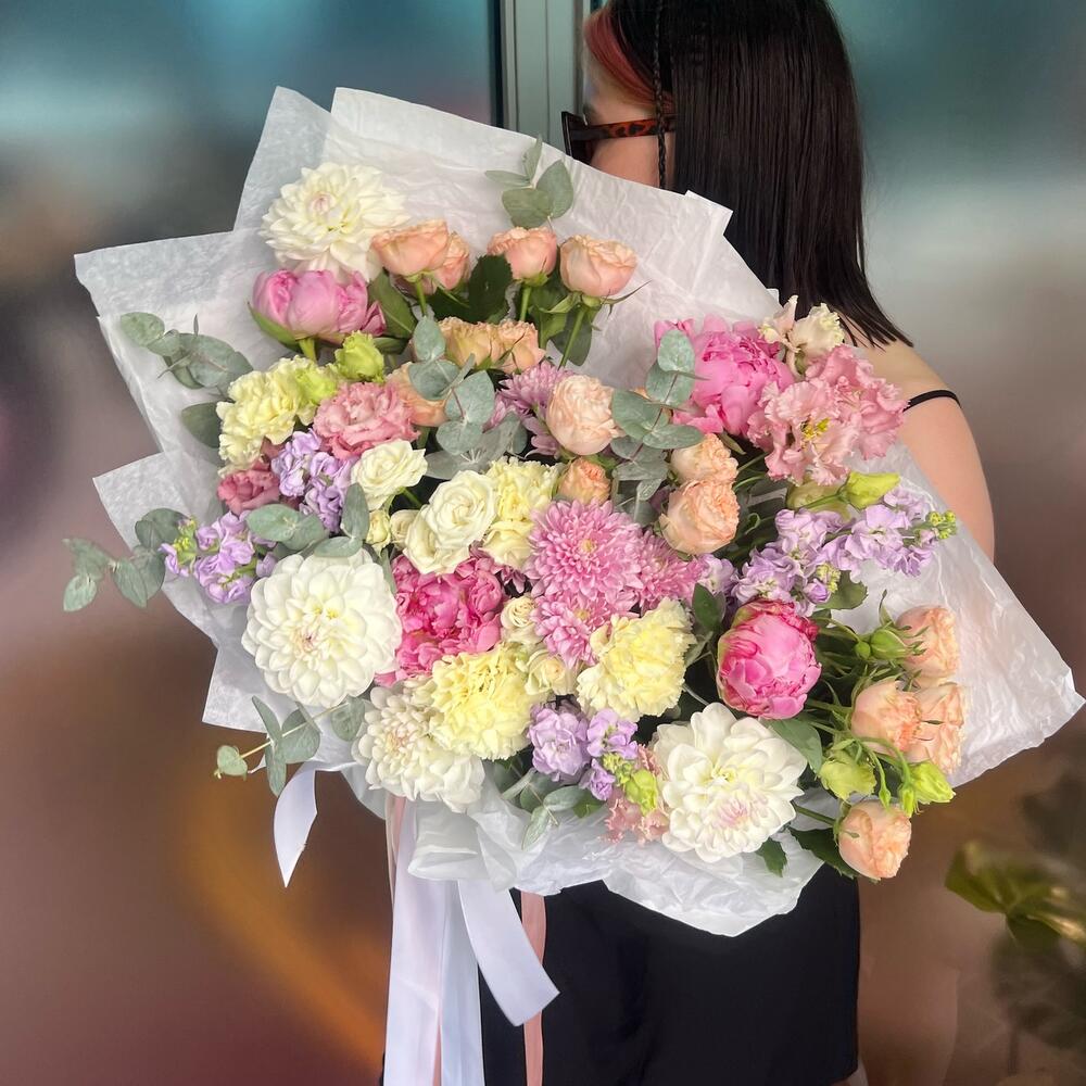 пионы сара бернар – 4 шт.Маттиола лавандовая – 4 шт.Лизиантус – 2 шт.Георгина белый – 4 шт.Диантус – 4 шт.Эвкалипт Синерия – 7 шт.Кустовая роза – 3 шт.Хризантема кустовая – 3 шт.Упаковка дизайнерская – 3 шт.Лента атласная – 2 шт.