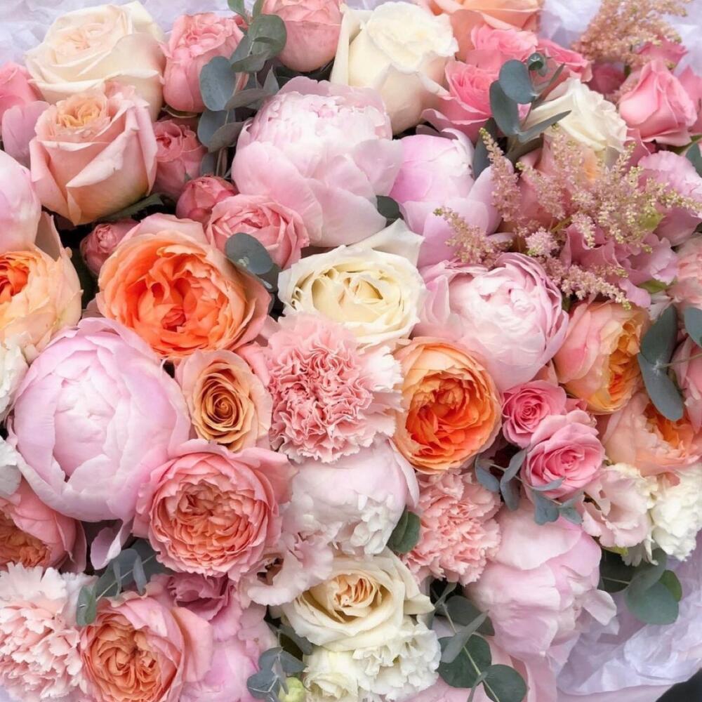 Альстромерии, Гвоздики, Кустовые розы, Лизиантусы, Розы, Хризантемы