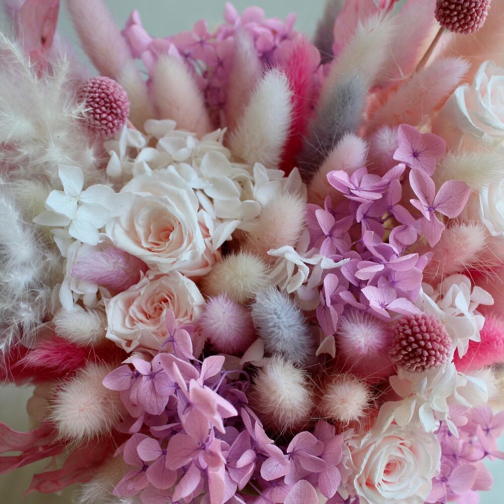 Роза одноголовая – 5 шт.Гортензия – 2 шт.пушистики – 1 шт.Керамическое кашпо – 1 шт.