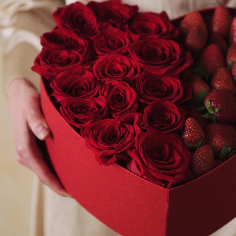 Коробка с клубникойКлубникаРозыКрасные розы