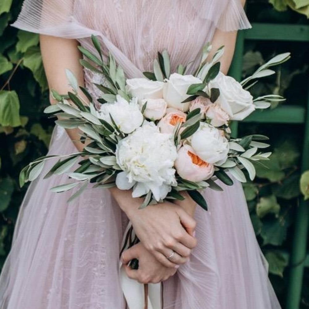 Пион белый – 3 шт.Фисташка пучок – 2 шт.Кустовая роза пионовидная – 3 шт.Роза одноголовая эквадор 40 см – 3 шт.олива зелень – 4 шт.садовая одноголовая роза – 2 шт.шнурок кожаный – 2 шт.