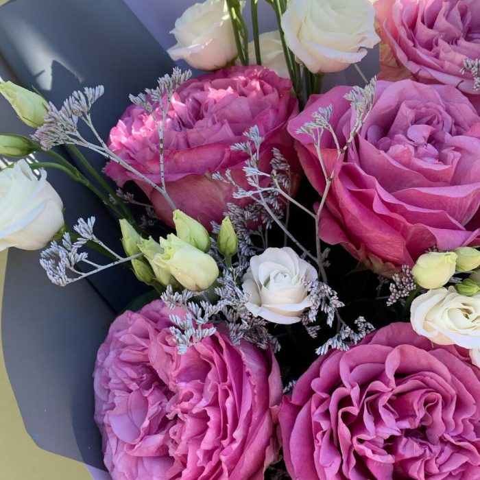 Лимониум – 3 шт.Роза одноголовая – 7 шт.Эустома – 2 шт.Лента атласная – 2 шт.Упаковка дизайнерская – 3 шт.краска флористическая – 1 шт.
