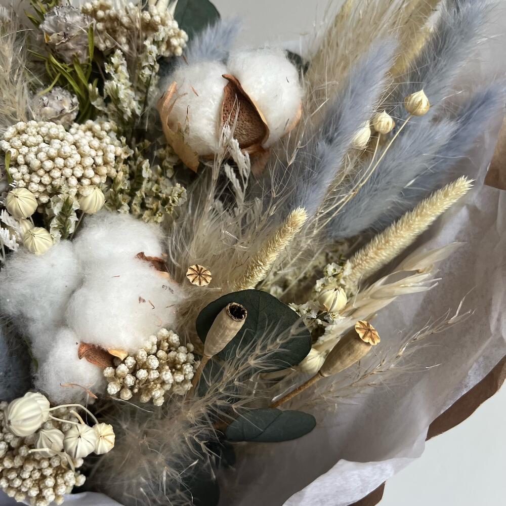 Лимониум – 1 шт.Озотамнус – 1 шт.Хлопок – 2 шт.Эвкалипт – 2 шт.Пшеница – 2 шт.Капс – 2 шт.Упаковка дизайнерская – 1 шт.Лен – 1 шт.Лагурус – 8 шт.Мак – 4 шт.Флум – 11 шт.пампасная трава – 1 шт.