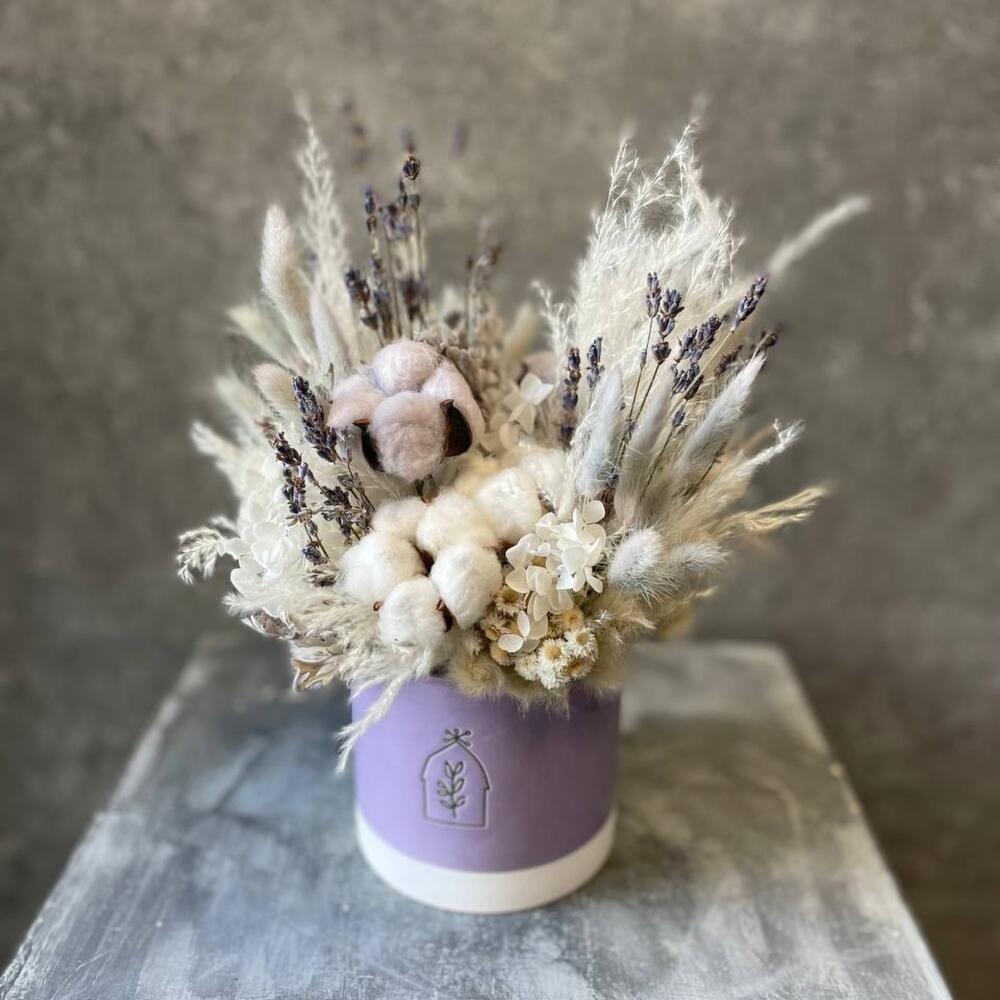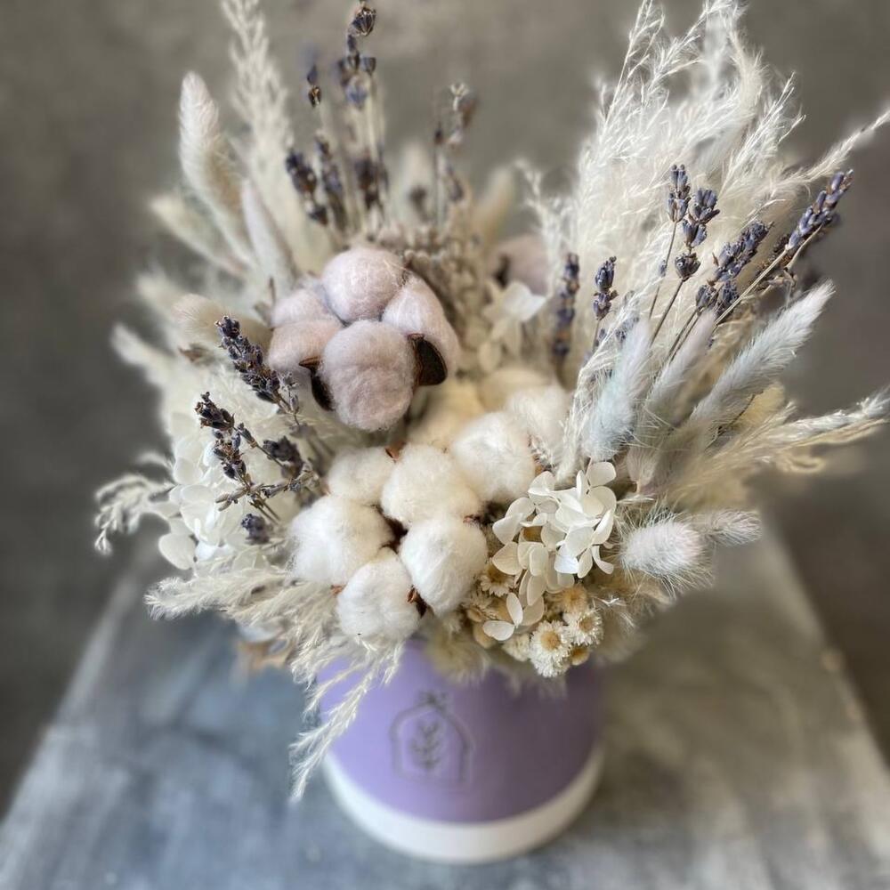 Кашпо керамическое – 1 шт.Хлопок натуральный – 5 шт.кортадерия – 1 шт.Лагурус (сухоцвет) – 25 шт.Лаванда – 40 шт.гортензия стабилизированная – 1 шт.анафилис – 5 шт.