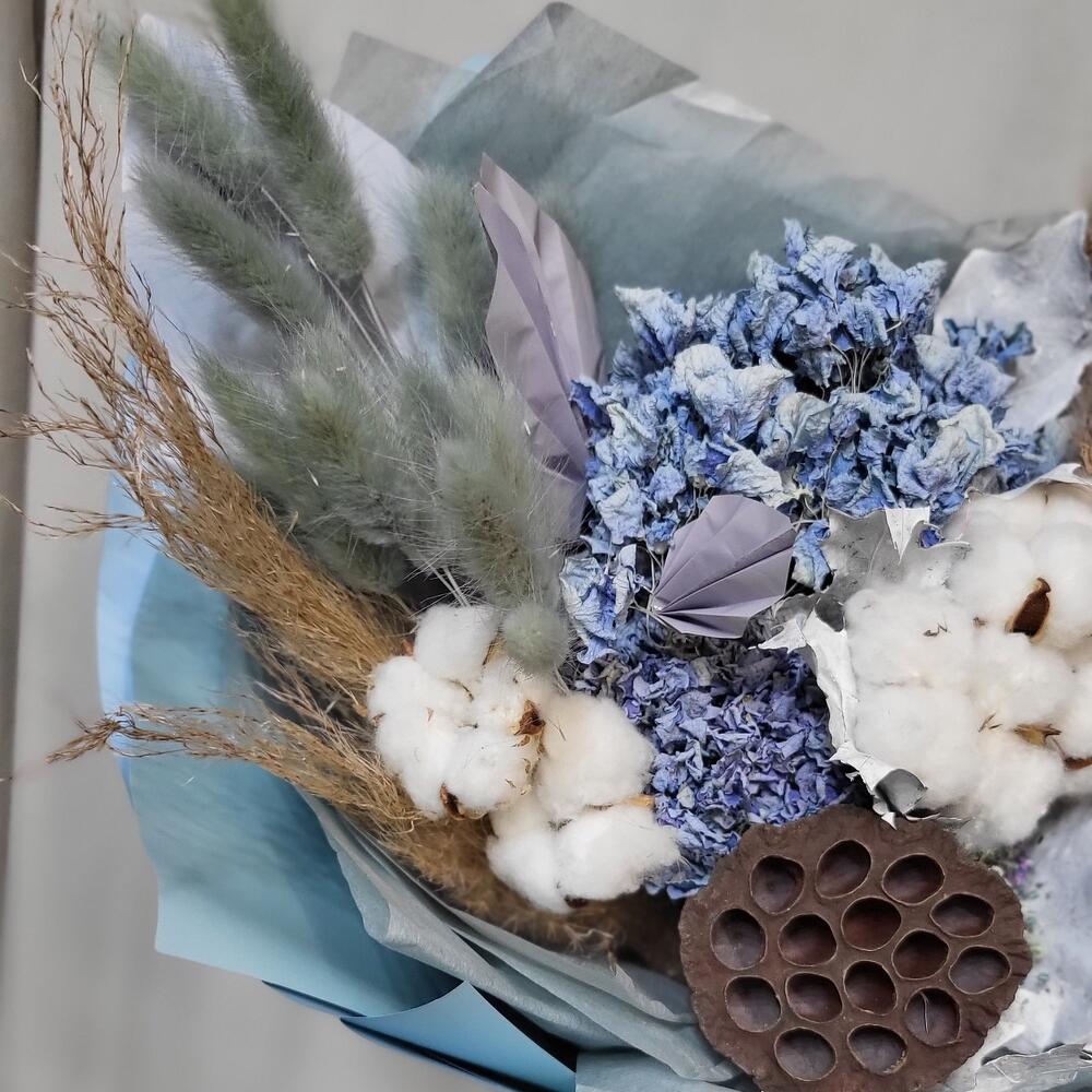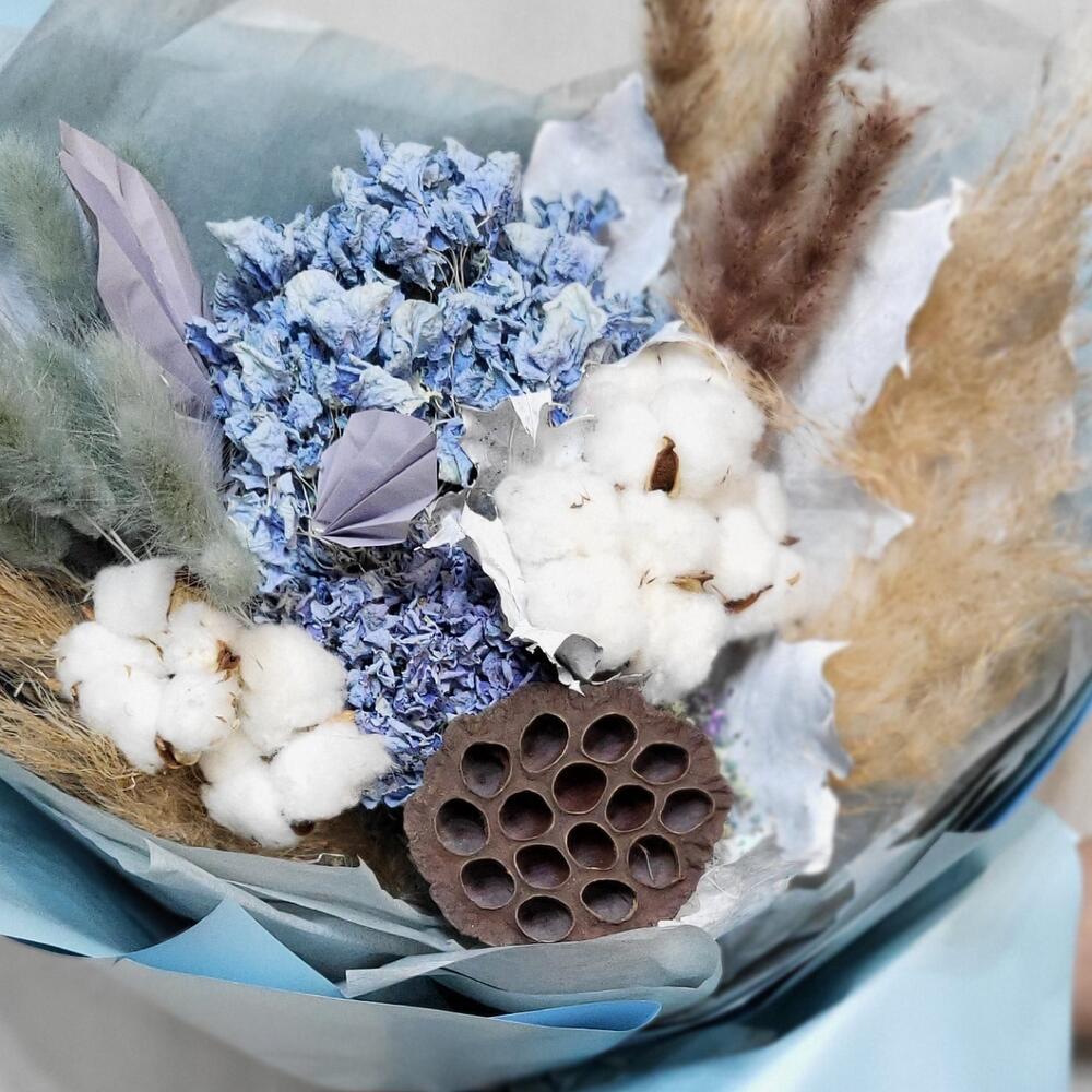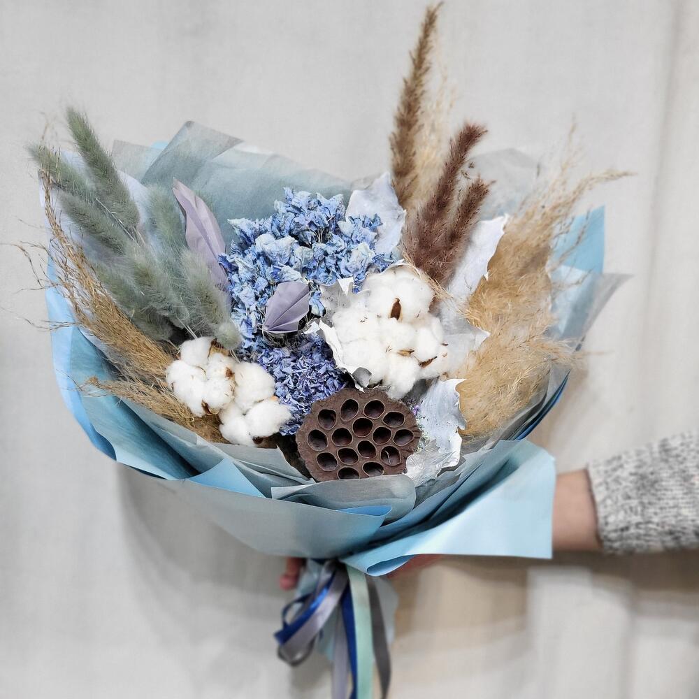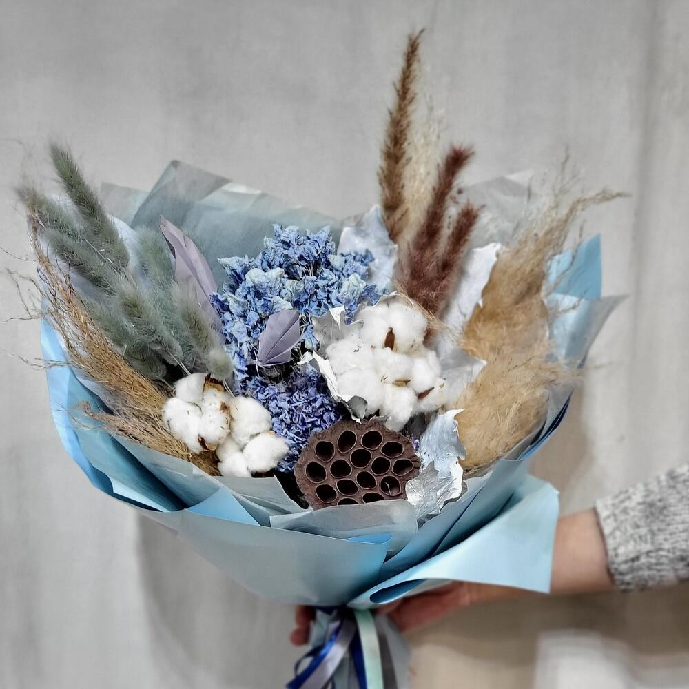 Гортензия – 2 шт.Лотос – 1 шт.Лагурус – 11 шт.кортадерия – 1 шт.Хлопок натуральный – 7 шт.бумага дизайнерская – 1 шт.