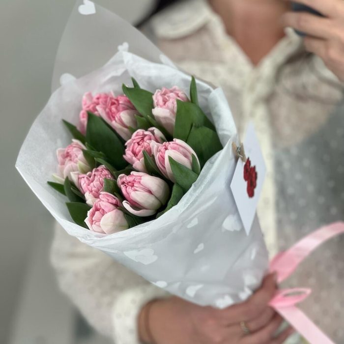 Упаковка – 2 шт.Лента атласная – 1 шт.Открытка – 1 шт.Тюльпан пионовидный – 9 шт.